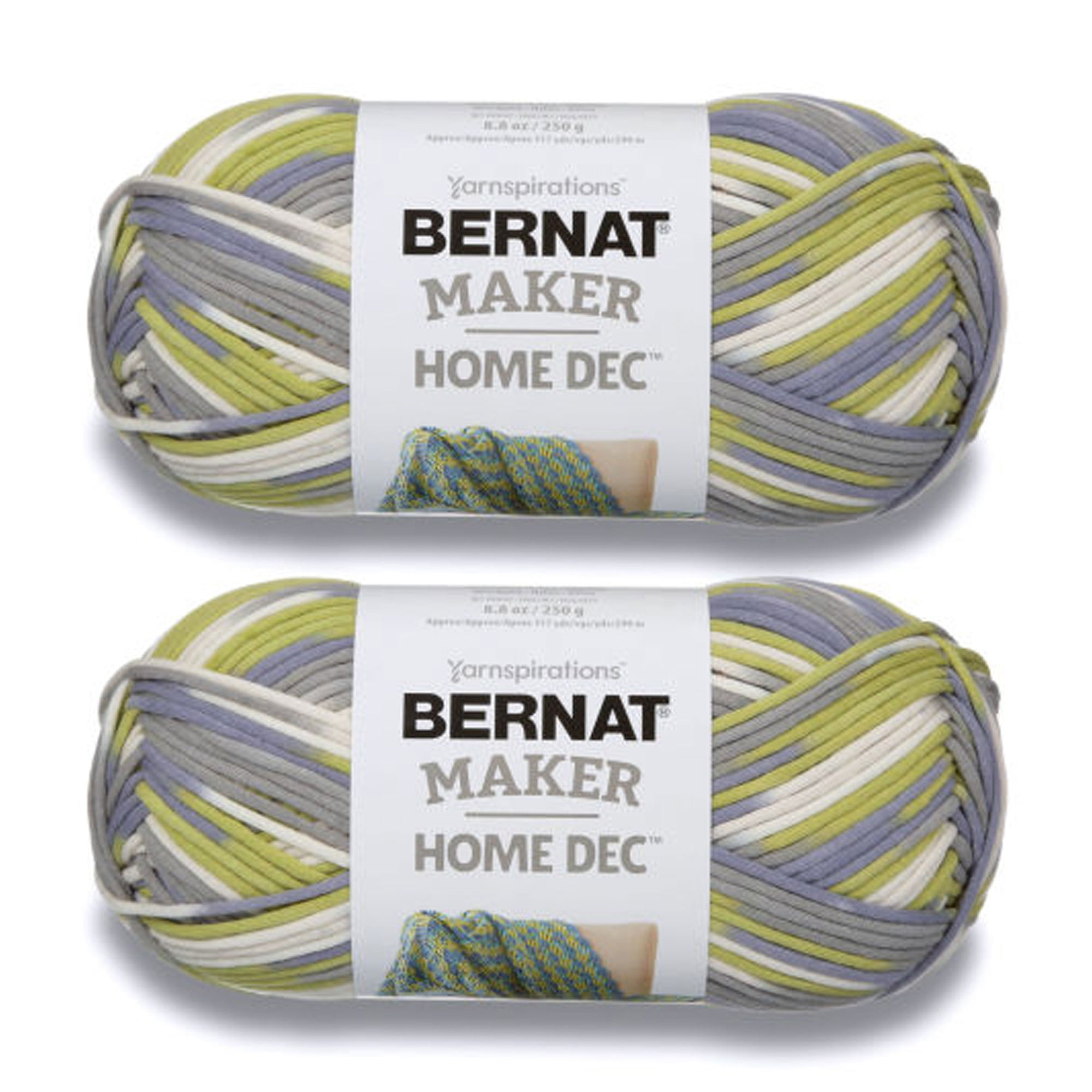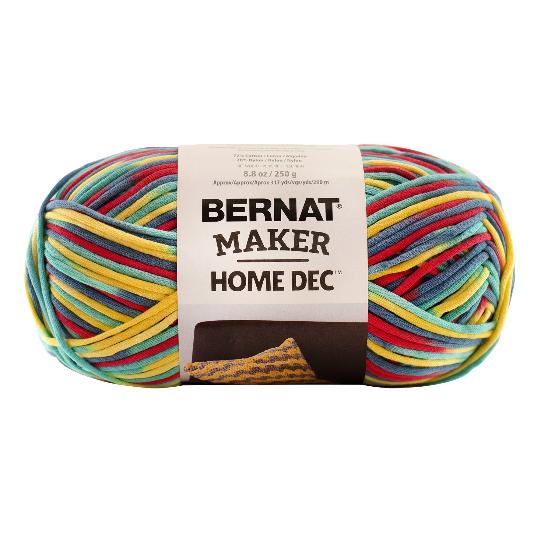 . Bernat Maker Home Dec is available in 16 coordinating colors, including 8 solids and 8 variegated yarns Content: 72% cotton, 28% nylon; Ball Size - 250g / 8.8 oz, 317 yards / 290 m; Care: Machine wash and dry; Gauge: 5 - Bulky.